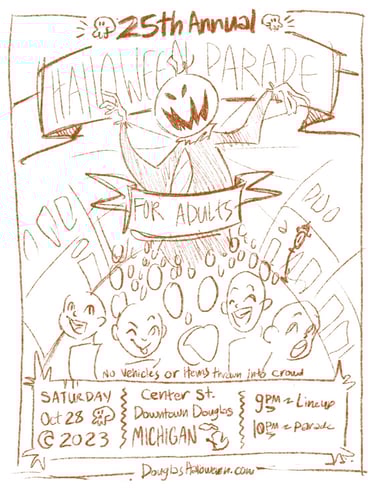 Every year around halloween, the little town of Douglas Michigan has a parade fit for kings... Jack the Pumpkin King that is! Over 12,000 people from all over the midwest show up for the 2+ hour parade to see thousands of creative costumes, floats and more... So it was a huge honor to be the illustrator for the posters, postcards and t-shirts!
