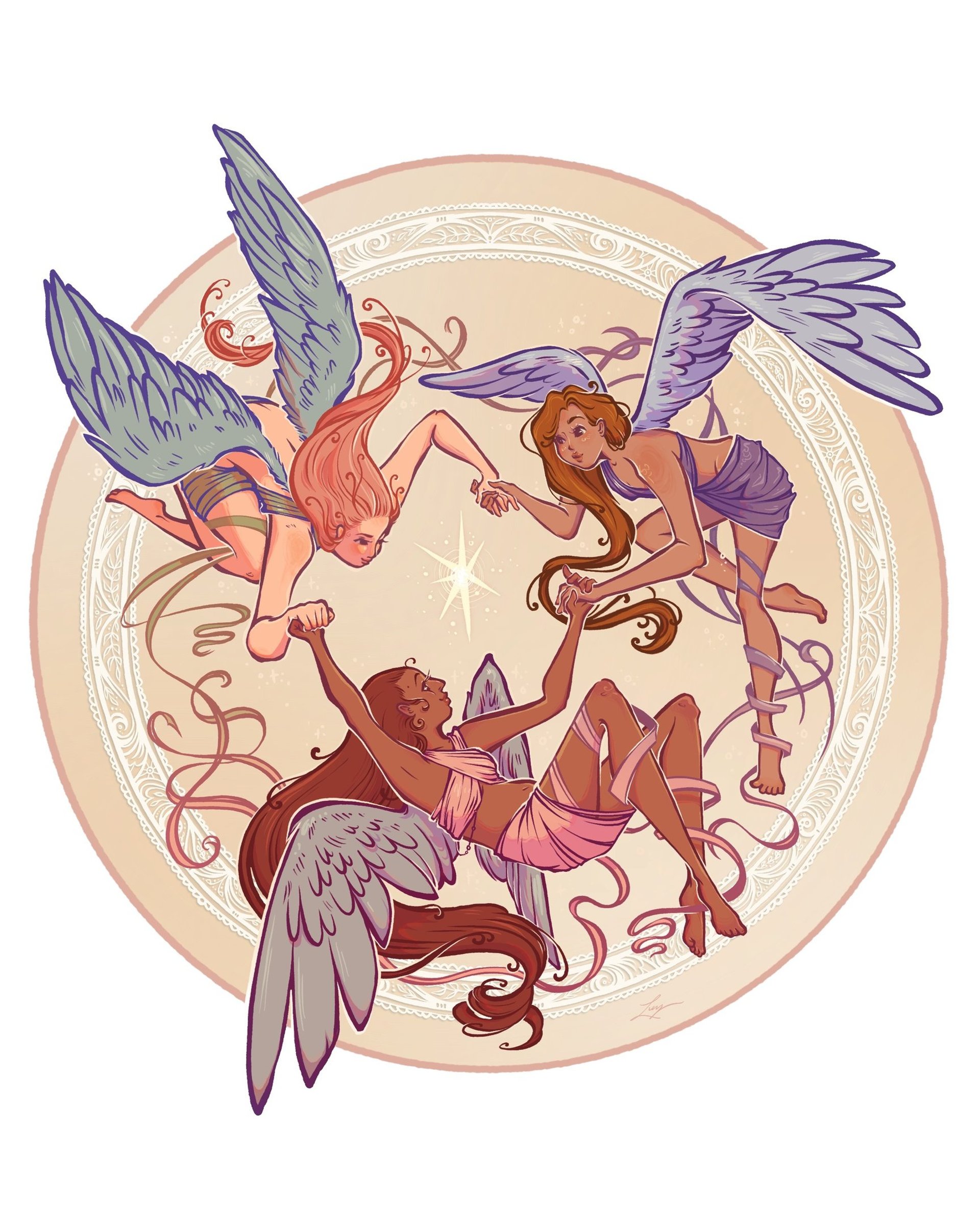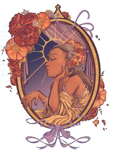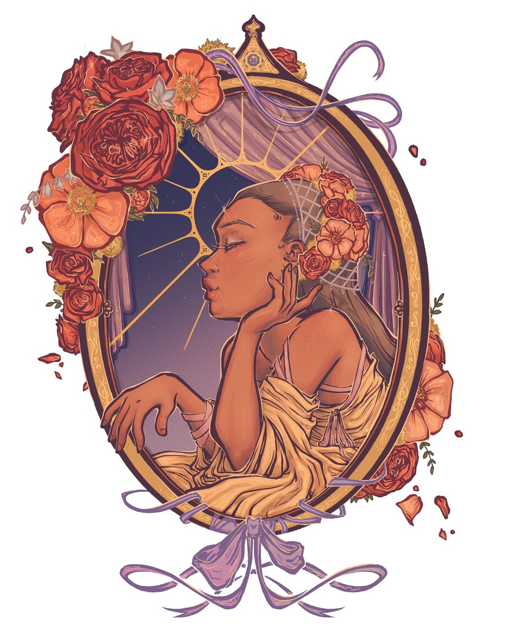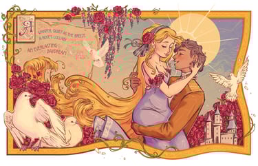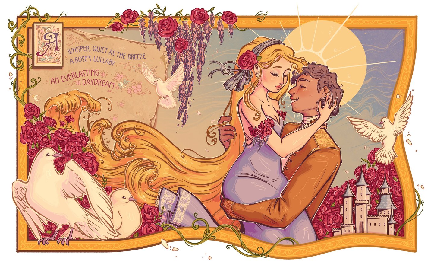 When I was coming up with a concept for my three illustrations, I knew I wanted to do something inspired by the storybooks of the 1800’s and one of my favorite art movements, Art Nouveau. I love the sweeping, organic nature of the style and I wanted to explore it more through my borders and line work, as well as express themes of femininity, love and beauty.