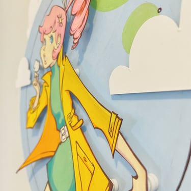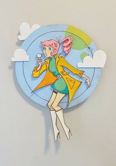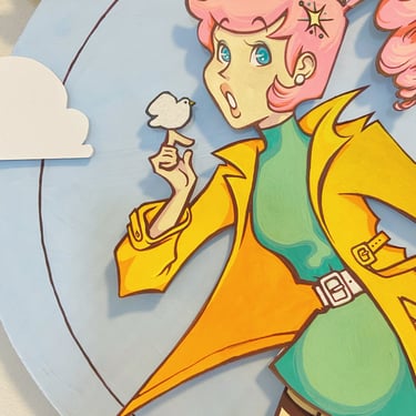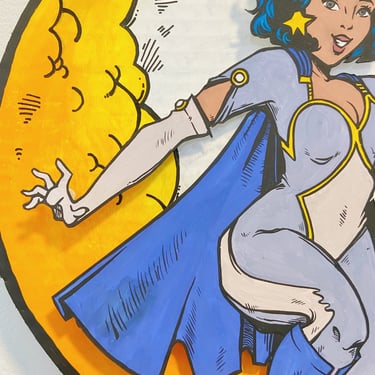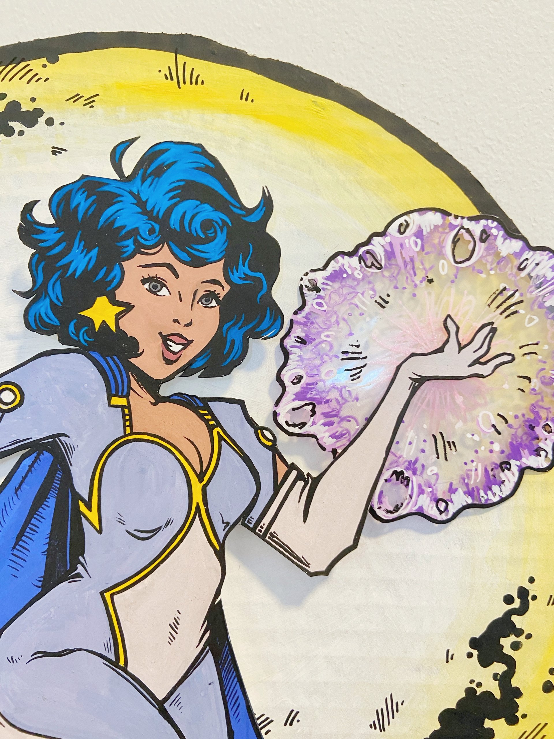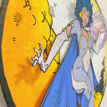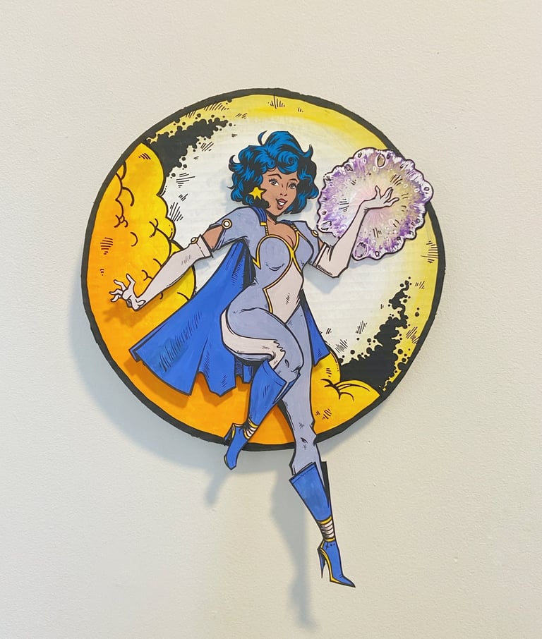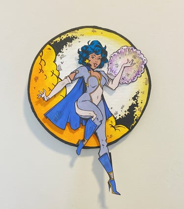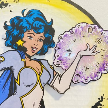 Time for a favorite of mine - the golden age of comics! This is a time when superheroes flourished and there was a classic style full of bright color, dramatic lineart and dynamic poses. I looked to my own personal collection of vintage Teen Titan and Wonder Woman comics for inspiration. Also, the power ball in her hand glitters and spins for a little extra pizzaz!