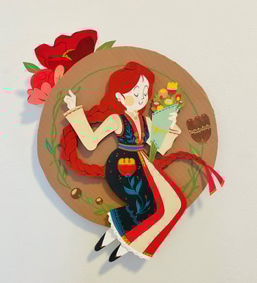 I decided to work with gouache (like a happy medium between watercolors and acrylic paints) and create 4 paper dolls each inspired by different "art moments". In the end I made dolls in the style of classic atomic midcentury, European folk art, the early editorial flapper girls of the 1920's and lastly, the golden age of comics. And just to make my life more difficult (its kind of my brand if you know me 😉) I created these dolls to be jointed so at least one part of them has movement!